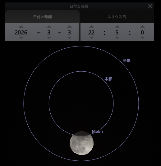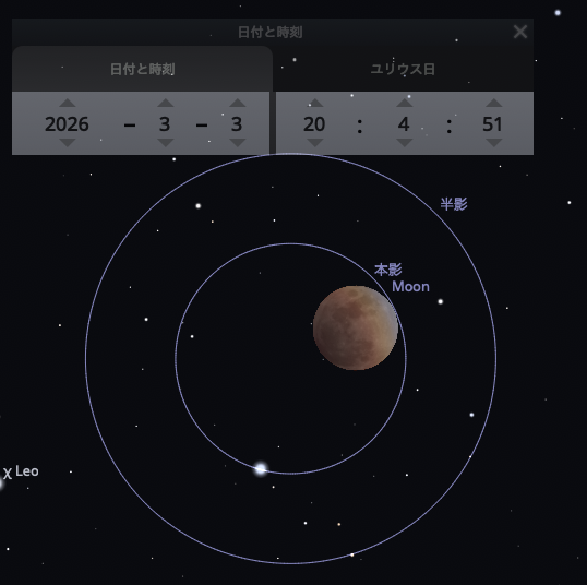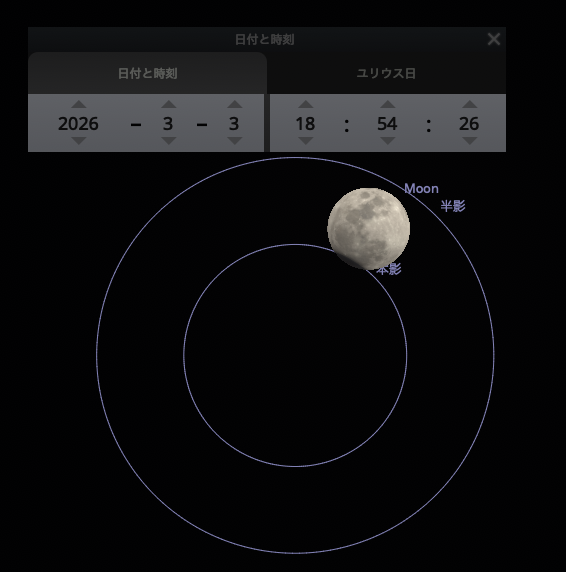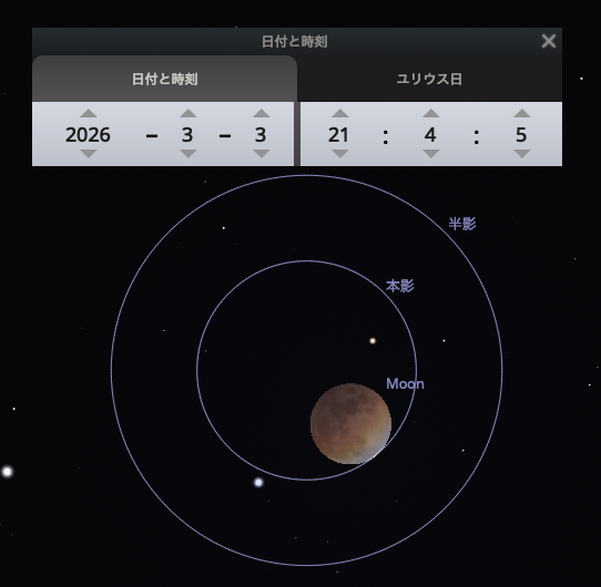 配信終了後、皆既月食が起こるときの地球の本影の位置をステラリウムで見ることができると聞いたので、早速試してみました。ちなみに月食が起ころうが起こるまいが影の位置を確認できるので、満月のときに「今夜はこの位置だから全然外れているなあ」と遊ぶことも出来るそう。面白い。