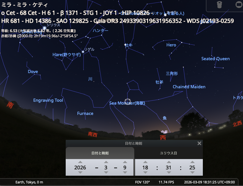 ミラはその明るさが2等級から10等級まで、330日間くらいかけて変わって戻ります。2025年10月時点では10等級のようですが、これからどんどん明るくなっていって、来年の3月上旬に2等級になるそうです。今見えていたら見ごろだったのですが、残念ながら10等級だとものすっっごい視力の持ち主でないと肉眼では無理ですね。3月だと、ギリギリ日没後に見えるかどうかで、見えたらラッキーかも知れません。魔性の女性の残り香でしょうか。