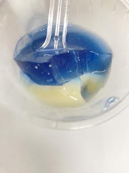 このスイーツは、ソーダー風ゼリーとミルクプリンの二層となっています。